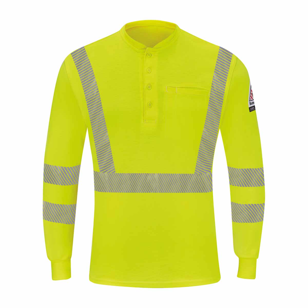 The Hi-Vis Lightweight Long Sleeve Henley features 360º visibility with front and back 2 inch segmented heat seal reflective trim. It has a four-button henley placket and a left chest pocket with pencil stall. With full underarm gussets, rib knit collar and cuffs, you will be free to move and work with comfort.