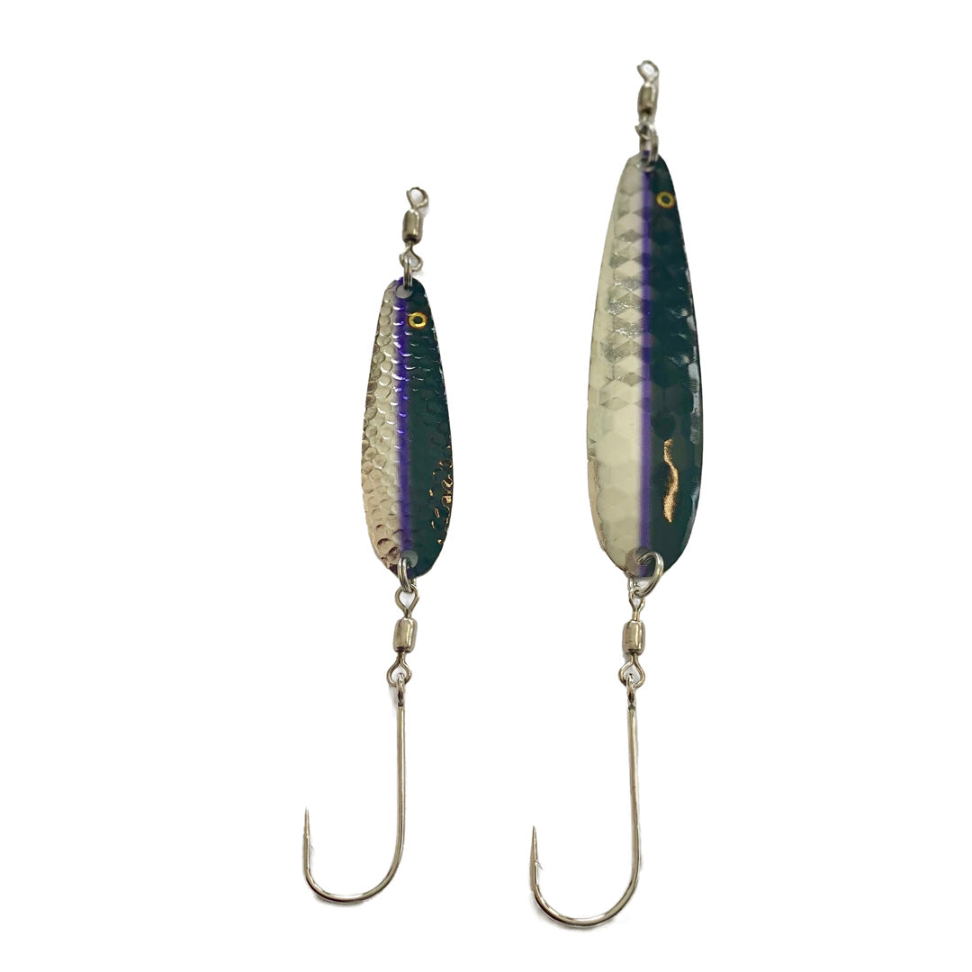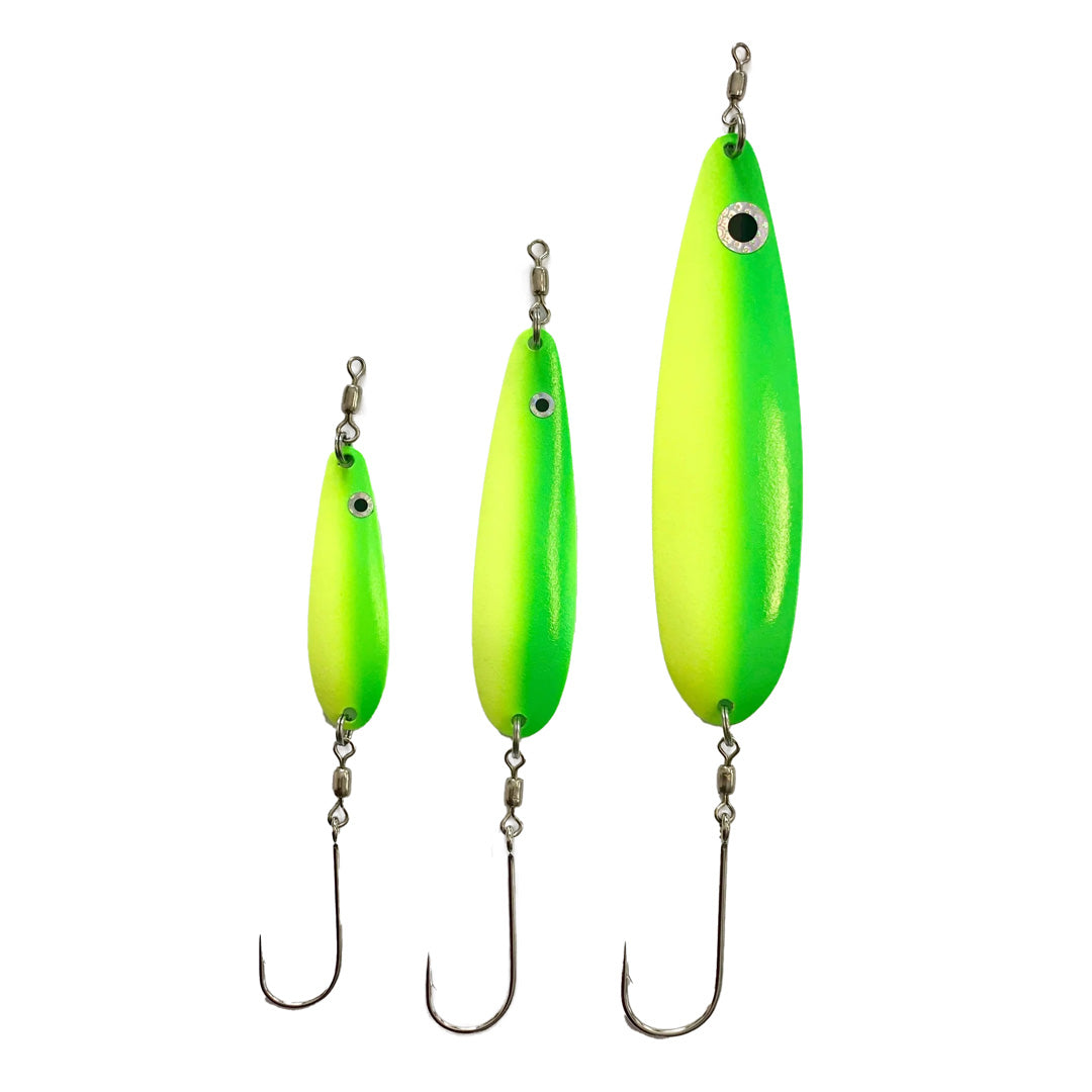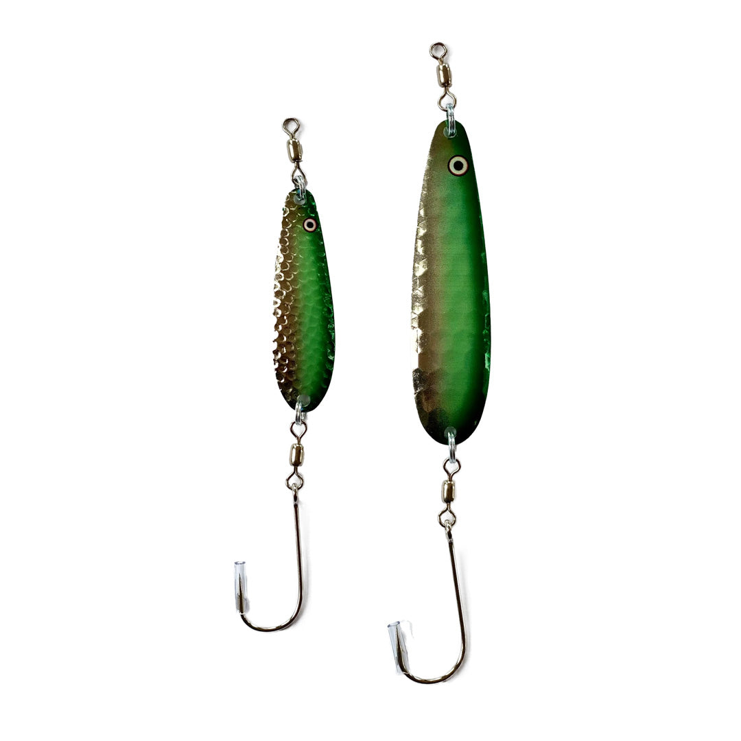 Painted on both sides in vibrant green and glow-in-the-dark yellow, The Hydra is a spoon, designed to catch any salmon's attention.