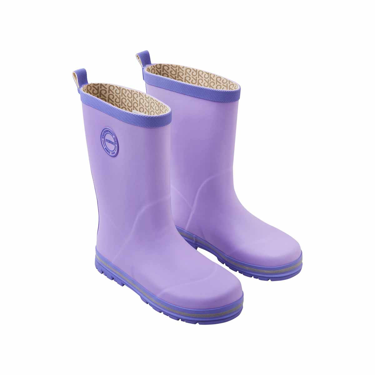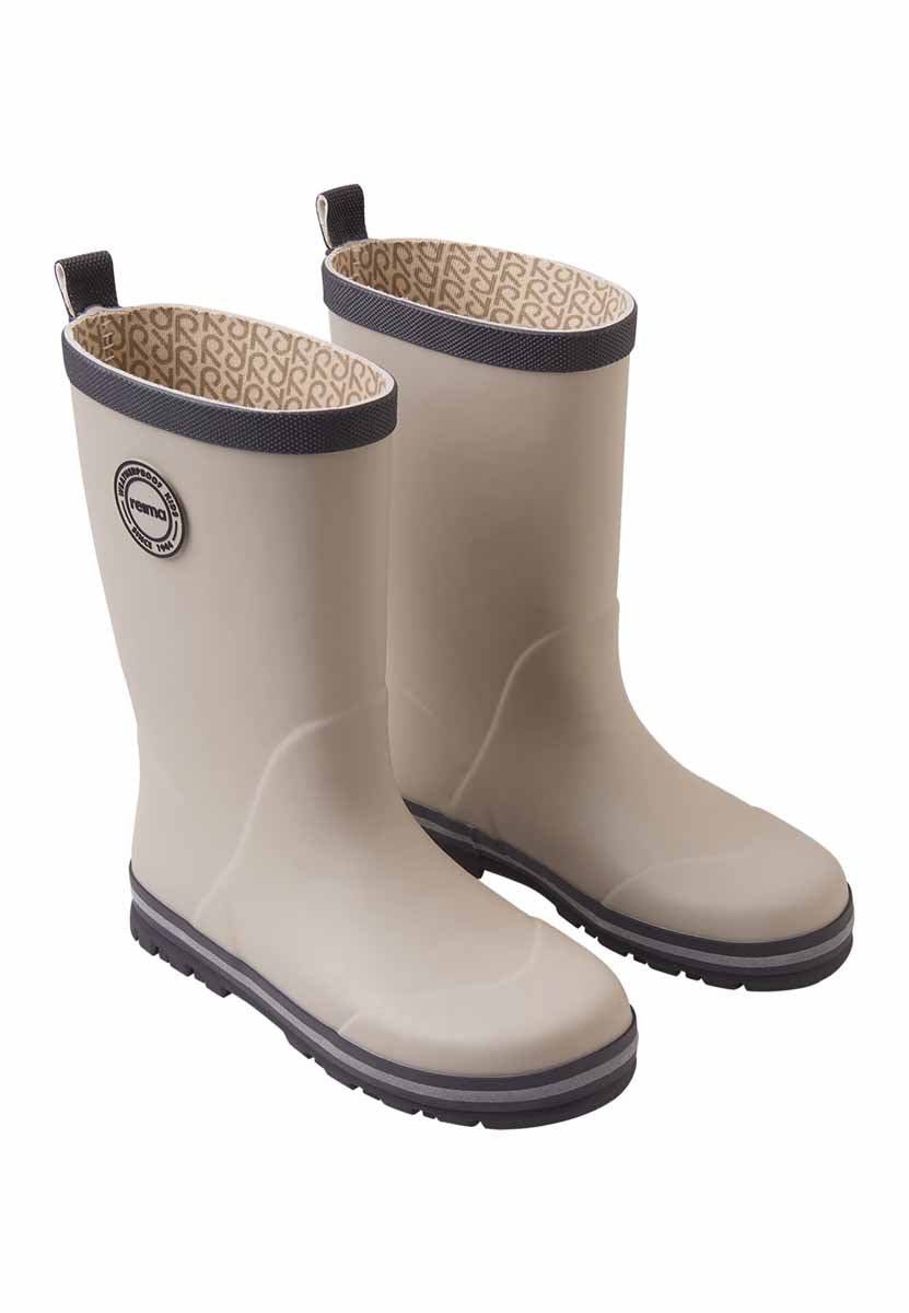 Classic cotton-lined rubber kids' wellies. The shaft height is designed to fit kids based on their age. With a reflective stripe around the sole, these Reima rubber boots are made from a material that includes 40% natural rubber, and the outsole is crafted from a vulcanized PVC-free rubber. The children's rain boots are lined with cotton for comfort and include removable insoles with the Happy Fit print to help you find the correct size.