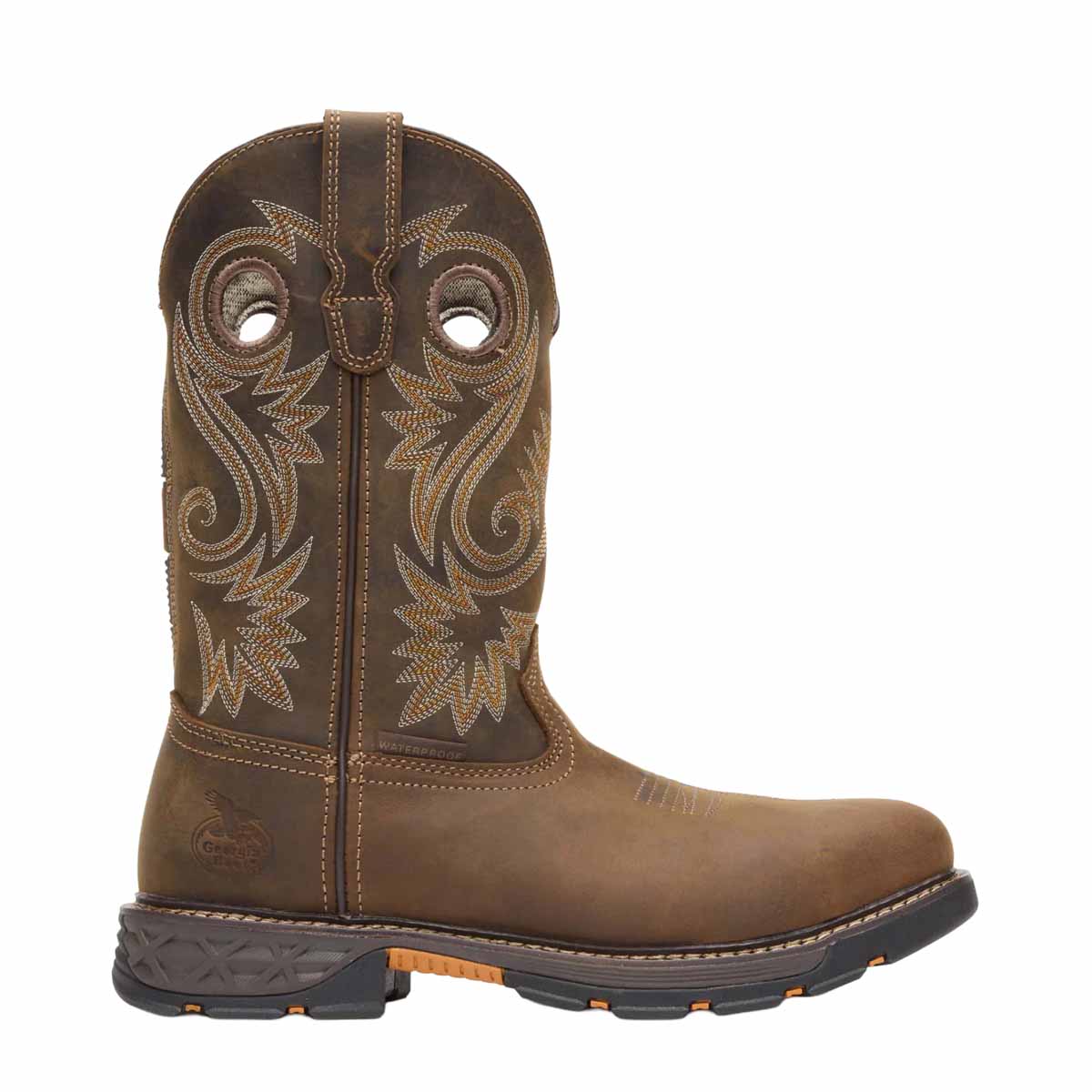 This full-grain leather brown boot is equipped with leather pull loops and our FLX-FIT technology on the rear for easy on and off. Inside you will find a high performance mesh lining and the Georgia Waterproof System. Our waterproofing is guaranteed to defend against water coming into your boot when working in wet conditions.