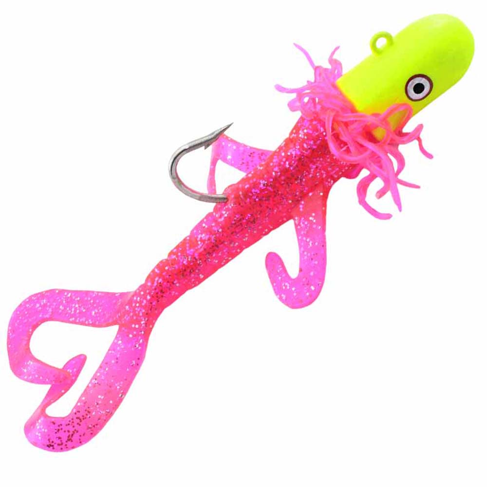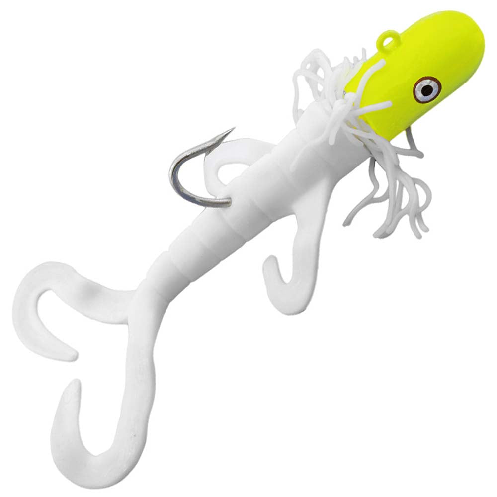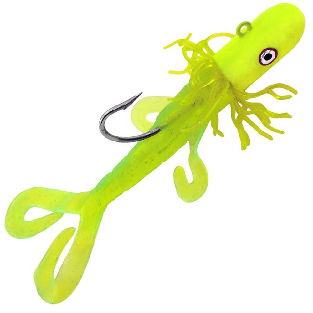 The Big Eye Jig combines the classic "Bullet" style jig head, brightened up with chartreuse paint inserted into a Delta Double Fin Plastic Tail with a curly skirt collar. The soft plastic parts of this jig create a unique and eye catching action when jigged, making it one of Delta's most popular Jigs!