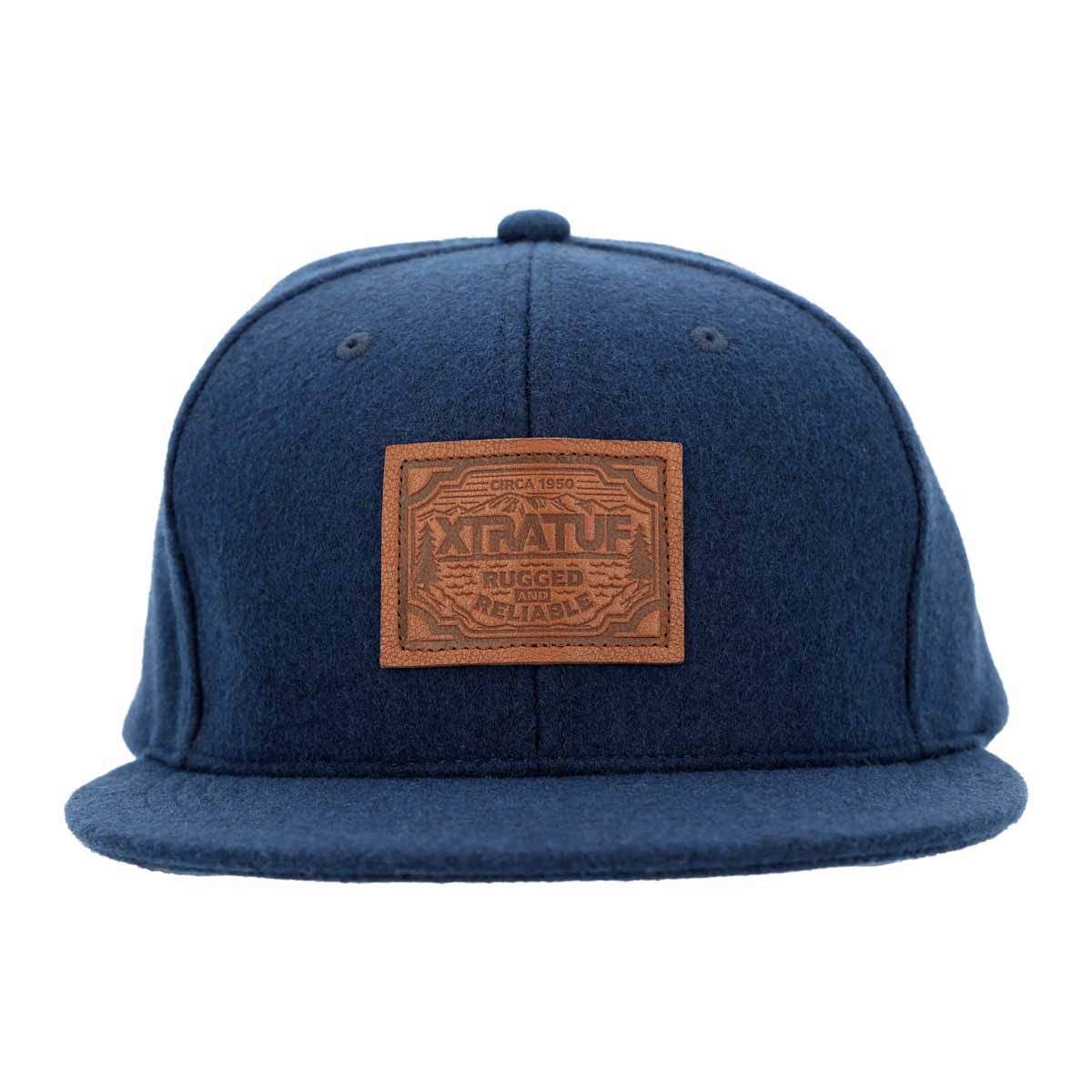 The Brushed Wool flat brim hat has a leather embossed patch on the front with a flat brim and a snapback closure. One size fits most.